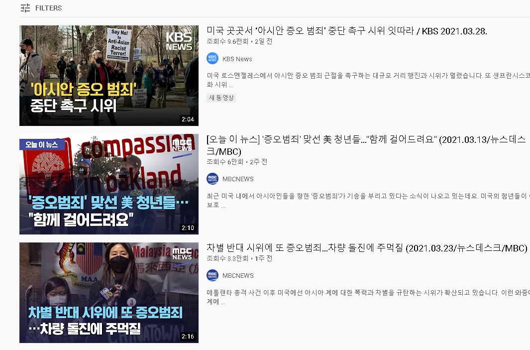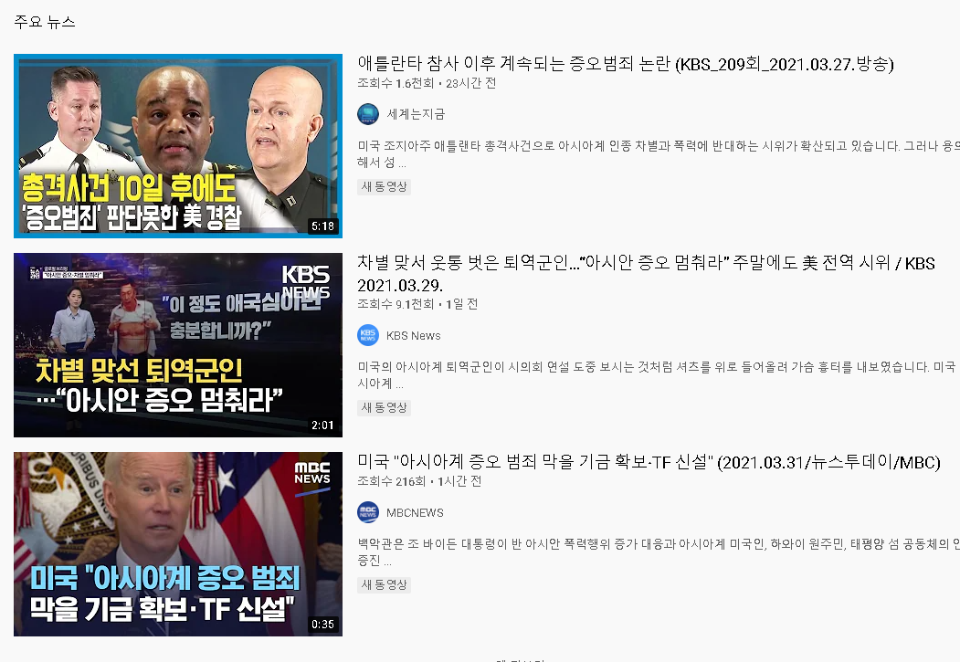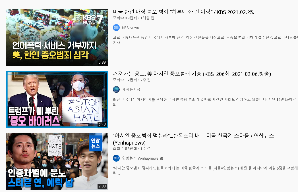 연일 쏟아져나오는 아시아인에 대한 증오범죄 유튜브