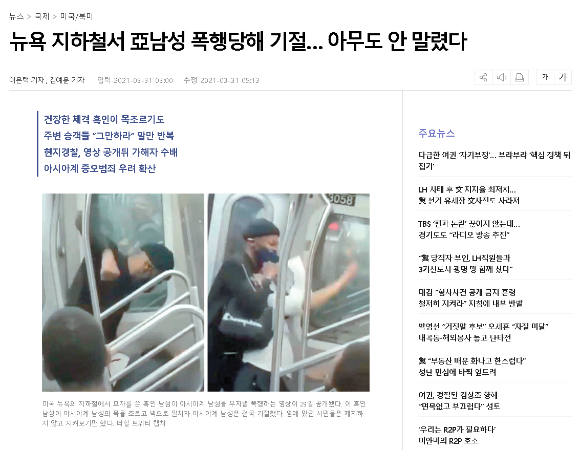 금일도 뉴스가 나왔습니다. 뉴욕 지하철에서 아시아 남성이 흑인남성에게 폭행당해서 기절한 기사내용입니다.