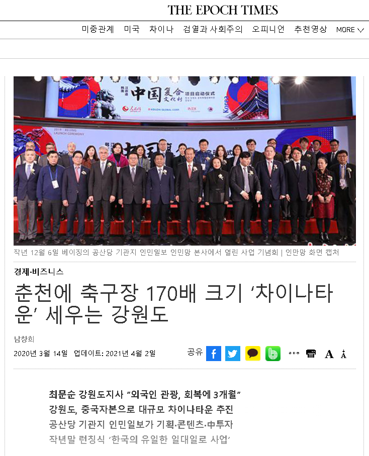 강원도가 6000억원을 투자해 춘천과 홍천 일대에 축구장 170배 크기의 한중복합문화타운 건설을 추진하자 반대의 목소리가 커지고 있다. 지난 29일 청와대 국민청원에는 ‘강원도 차이나타운 건설을 철회해주세요’라는 청원 글이 올라왔다. 청원자는 "왜 대한민국에 작은 중국을 만들어야 하냐"며 "국민들은 대체 왜 우리나라 땅에서 중국의 문화체험 빌미를 제공해야 하는지 이해할 수 없으며 단호하게 반대한다. 중국에 한국 땅을 주지 마세요"라고 밝혔다.