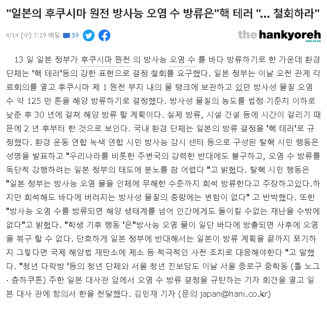 최근 좋은 소식은 없네요. 오늘 일본에서 후쿠시마 방사능 오염수를 바다로 방류한다는 뉴스가 있었습니다.