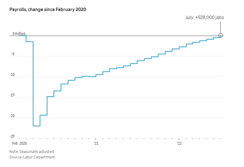 고용 회복 에는 거의 2년 반이 걸렸으며, 올해 상반기에는 고용이 경제 수축의 시작을 특징으로 하는 다른 제2차 세계 대전 이후 기간보다 빠르게 성장한 기간이 포함되었습니다. 노동부는 지난 달 실업률이 3.5%로 떨어졌으며 이는 2020년 초 팬데믹 직전에도 반세기 최저치를 기록했다고 밝혔다.