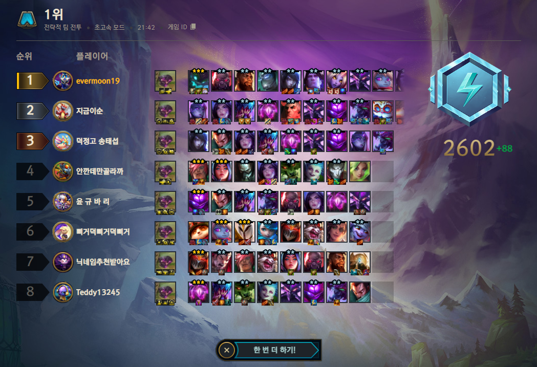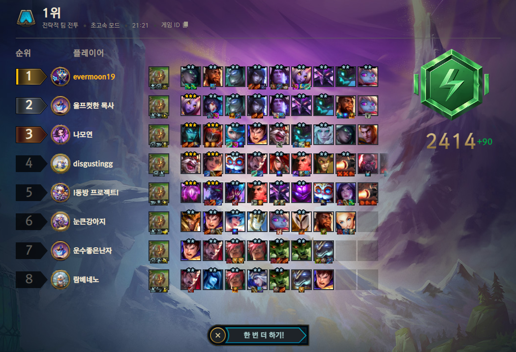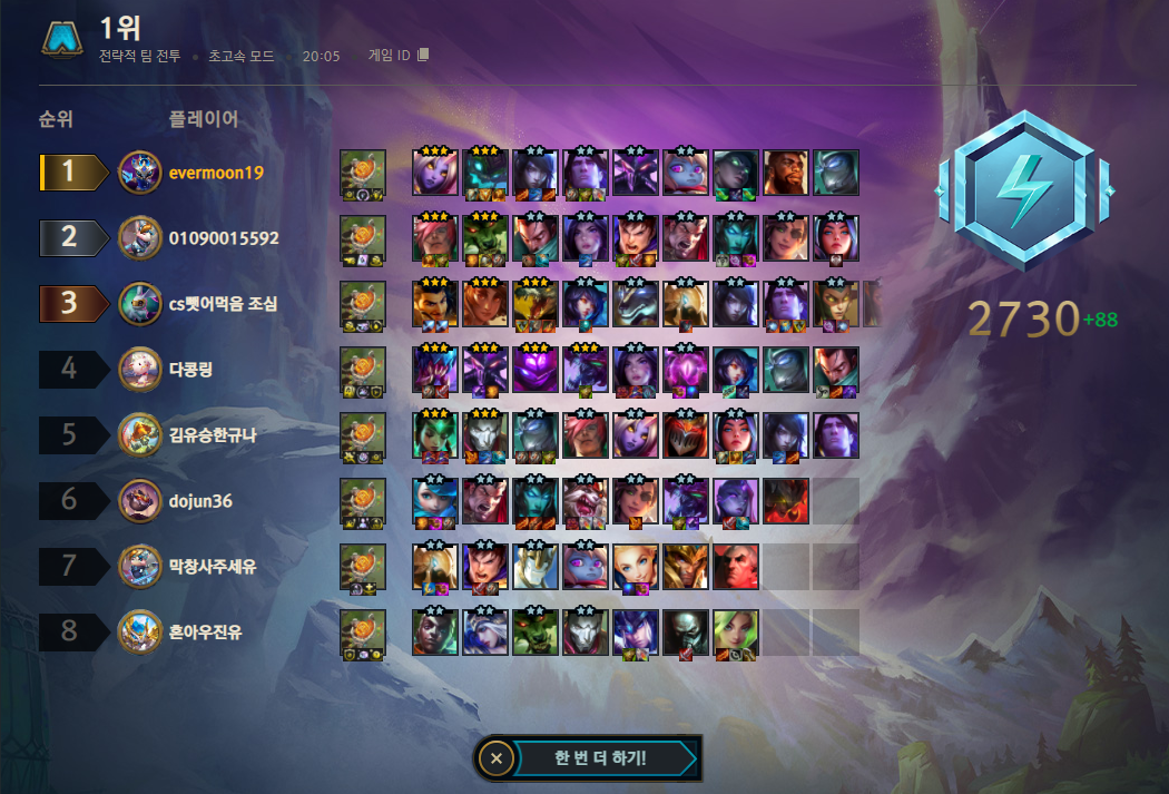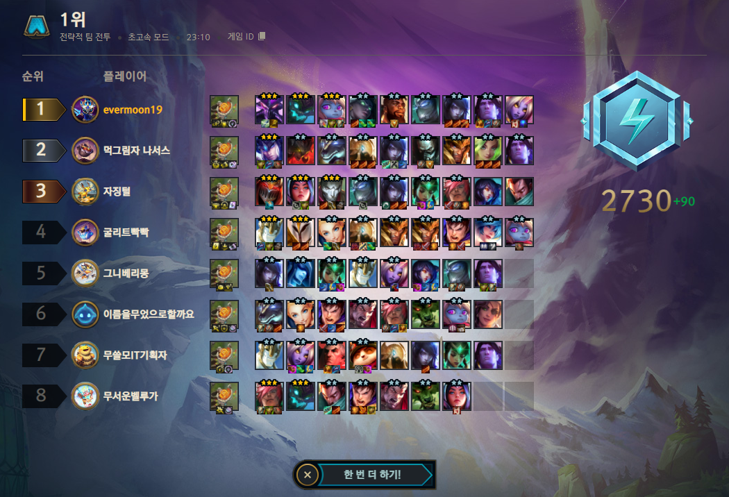 스샷은 여러장 찍지 못했지만 성능이 나름 괜찮습니다. 3성 챔피언이 몇명이든 그냥 몸으로 버티고 조져줍니다.