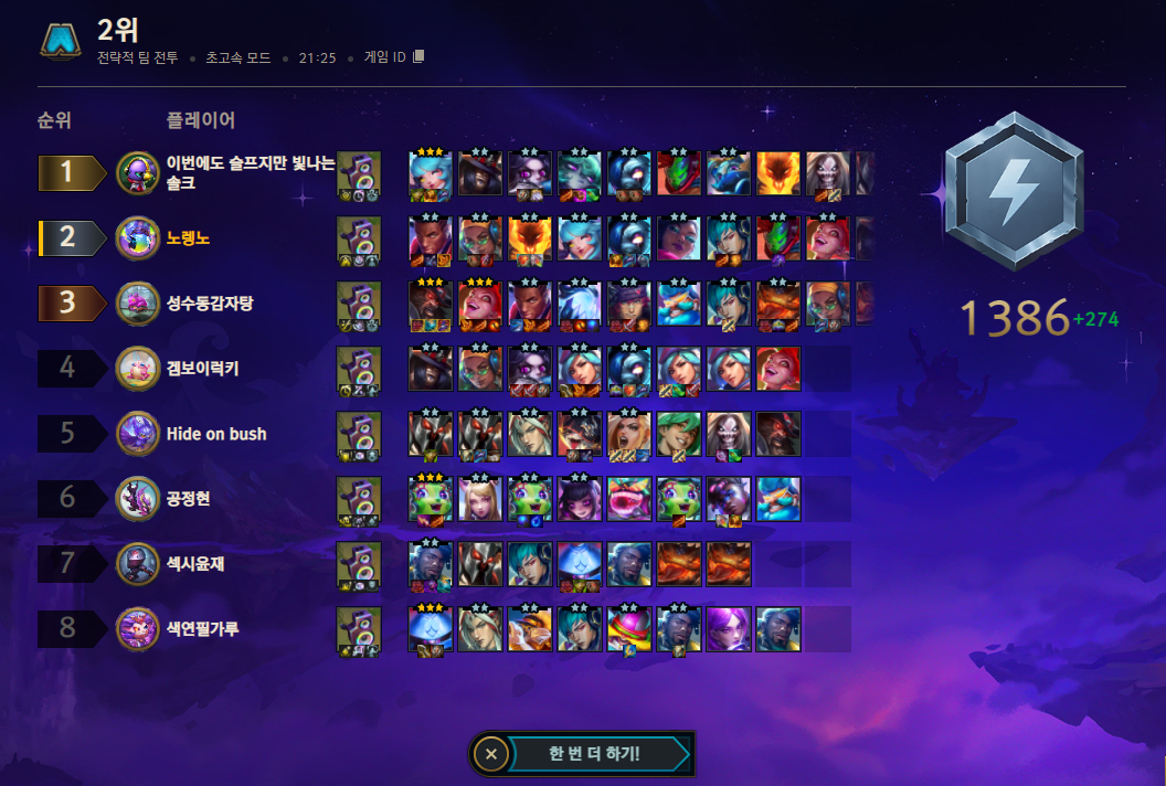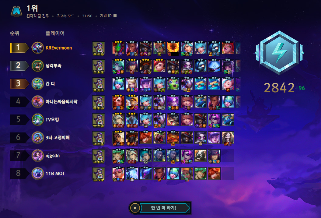 아쉽게 2위를 할때도 있고 1위를 할때도 있지만 템차이가 심할때는 방법이 없습니다.